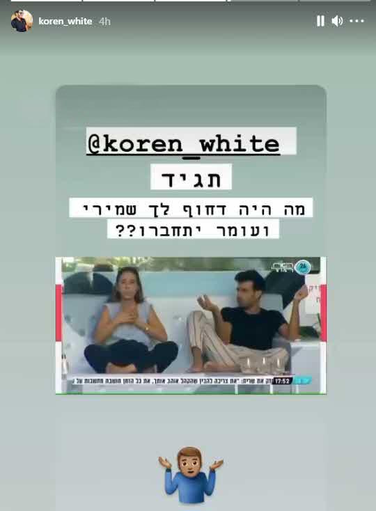 קורן כבר הספיק להגיב לאותו קטע שראיתם ממש עכשיו והעלה תגובה בסטורי לשאלה:"מה היה דחוף לך שמירי ועומר יתחברו??" והתגובה שלו הייתה מעט קצרה, אולי אפילו מתעתעת – אמוג'י בודד שמשאיר המון מקום לדימיון: 🤷🏻♂️