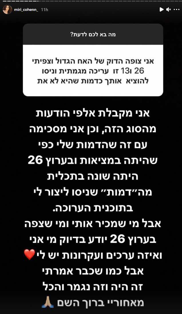 "אני מקבלת אלפי הודעות מהסוג הזה, וכן אני מסכימה עם זה שהדמות של כפי שהיתה במציאות ובערוץ 26 היתה שונה בתכלית מה'דמות' שניסו ליצור לי בתוכנית הערוכה. אבל מי שמכיר אותי ומי שצפה בערוץ 26 יודע בדיוק מי אני ואיזה ערכים ועקרונות יש לי. אבל כמו שכבר אמרתי. זה היה וזה נגמר והכל מאחוריי ברוך השם."