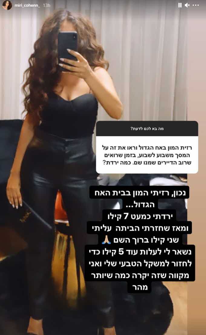 עוד נושא מאוד מרכזי בו עסקה מירי בתגובות לשואלים בסטורי הוא נושא הירידה במשקל שלה. מירי טענה שרזתה כמעט 7 קילו בבית "האח הגדול" והספיקה להשיב למשקלה מאז החזרה הביתה, 2 קילוגרמים מתוך ה-7. אך מה הייתה הסיבה לירידה הפתאומית במשקל בבית? נראה שגם לכך יש תשובה.