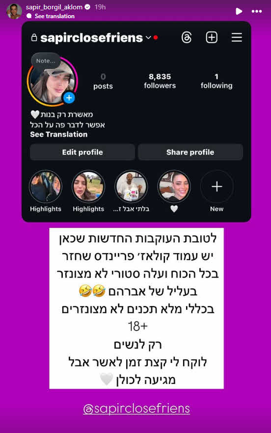 ספיר שיתפה את עוקביה: "לטובת העוקבות החדשות שכאן, יש עמוד קלואז פריינדס שחזר בכל הכח ועלה סטורי לא מצונזר בעליל של אברהם. בכללי, מלא תכנים לא מצונזרים 18+ רק לנשים".