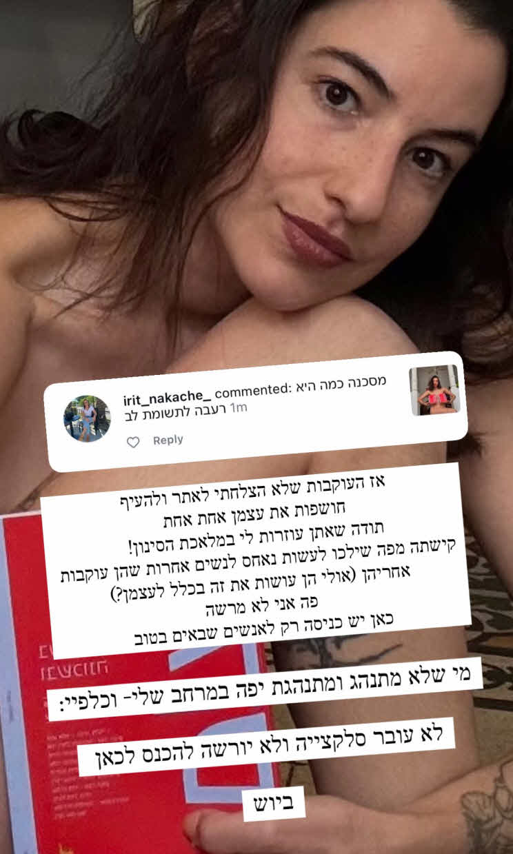 "קישתה מפה, שילכו לעשות נאחס לנשים אחרות שהן עוקבות אחריהן (אולי הן עושות את זה בכלל לעצמן?). פה אני לא מרשה, כאן יש כניסה רק לאנשים שבאים בטוב. מי שלא מתנהג ומתנהגת יפה במרחב שלי וכלפיי לא עובר סלקציה ולא יורשה להיכנס לכאן. ביוש".