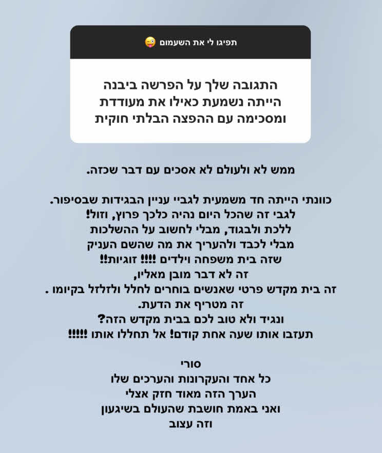 והוסיפה: "זה לא דבר מובן מאליו, זה בית מקדש פרטי שאנשים בוחרים לחלל ולזלזל בקיומו. זה מטריף את הדעת. ונגיד ולא טוב לכם בבית מקדש הזה? תעזבו אותו שעה אחת קודם! אל תחללו אותו!".