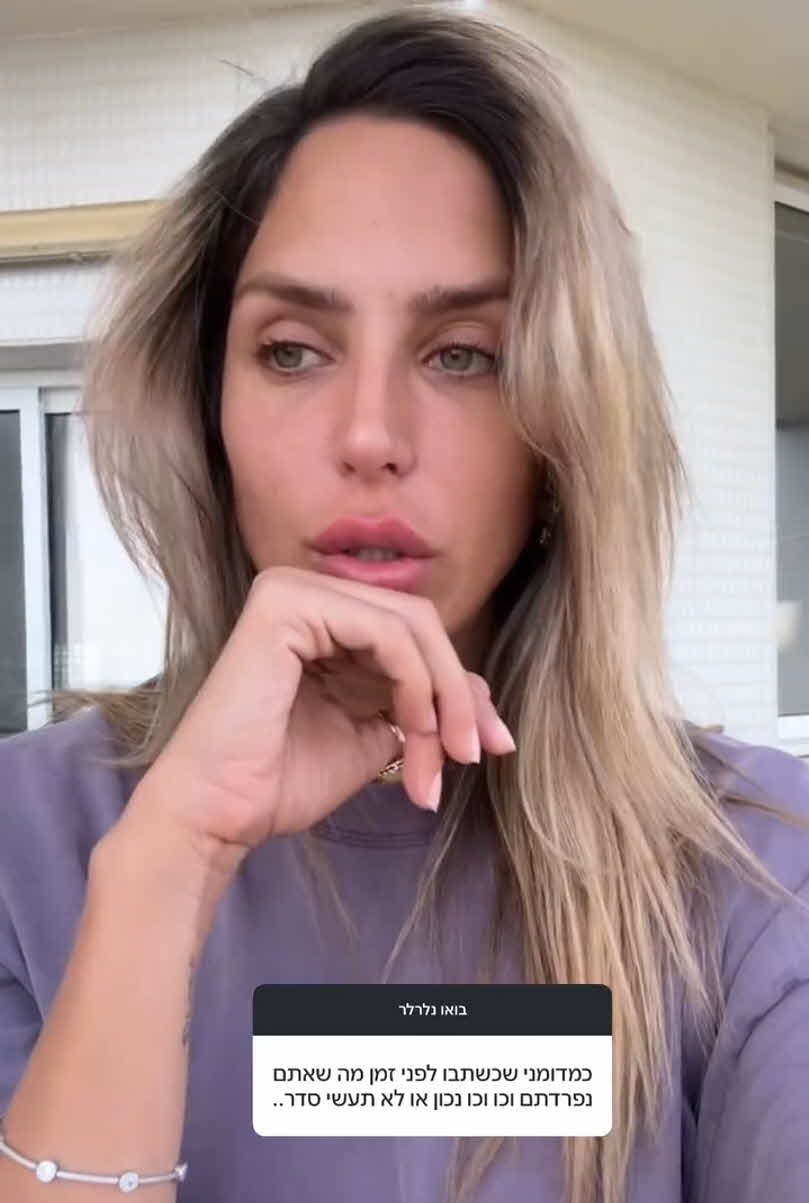"עלו ידיעות שאנחנו במשבר וקצת שמועות שנפרדנו. שוב, גם זה נושא שצריך לפתוח אותו בצורה מסודרת בשביל להעביר את המסר או לספר את הסיפור של מה שעומד מאחורי זה. אגב, אני שמחה במה שקרה ומה שקורה. זה השיעור הכי נכון בחיים. אין דבר כזה זוגיות שבאה פיקס ויאללה הכל דבש, ובום בום בום, ילדים משפחה".