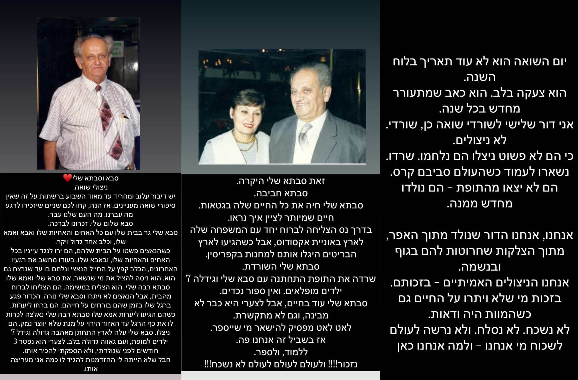 "יום השואה הוא לא עוד תאריך בלוח השנה. הוא צעקה בלב. הוא כאב שמתעורר מחדש בכל שנה", כתבה. "אני דור שלישי לשורדי שואה – כן, שורדי, לא ניצולים. אנחנו הדור שנולד מתוך האפר, מתוך הצלקות שחרוטות להם בגוף ונשמה. אנחנו הניצולים האמיתיים, בזכותם".
