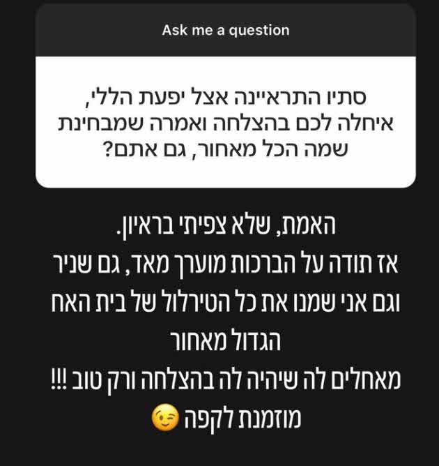 שי-לי עופרי נשאלה על ידי עוקביה אם היא ושניר שמו הכל מאחור כפי שסתיו טענה לכאורה. שי לי הפתיעה וכתבה: "האמת, שלא צפיתי בראיון. אז תודה על כל הברכות, מוערך מאוד. גם שני וגם אני שמנו את כל הטירלול של בית האח הגדול מאחור".