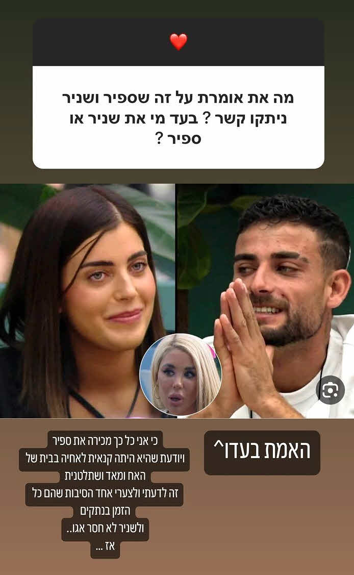 כזכור, אותו סטורי של סתיו דווקא הוביל לסטורי הסולחה מצדה של ספיר שהתייחס לאותה תגובה שלה על שניר: "יפה שלי, במקום לחפש כותרת מיותרת בואי נתעסק באהבת חינם. את מוזמנת אלינו לקפה, נשים הכל בצד. אני ואברהם(אבנר) מחכים לך ברבי".