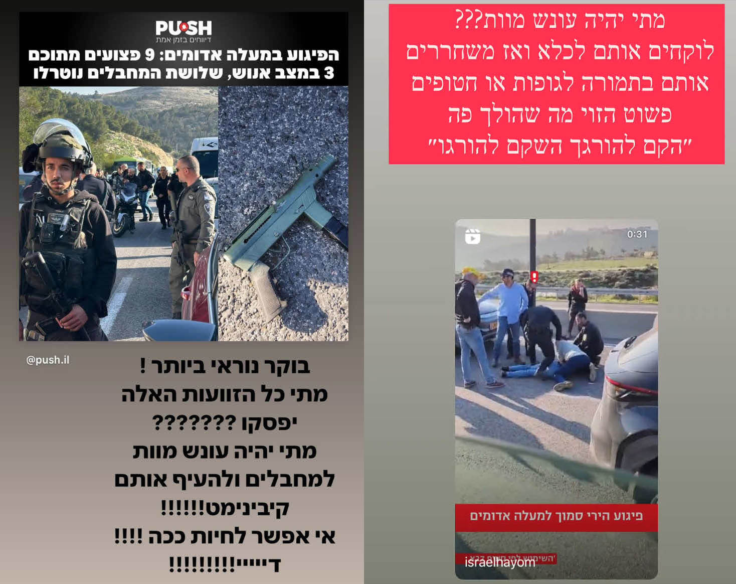 קצין שיתפה את הקטע שבו אחד המעורבים נעצר על הכביש וכתבה: "מתי יהיה עונש מוות???? לוקחים אותם לכלא ואז משחררים אותם בתמורה לגופות או חטופים. פשוט הזוי מה שהולך פה. 'הקם להורגך, השקם להורגו".