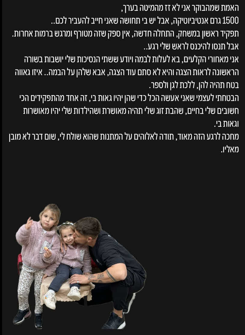 "הבטחתי לעצמי שאני אעשה הכל כדי שהן יהיו גאות בי, זה אחד מהתפקידים הכי חשובים שלי בחיים, שהבת זוג שלי תהיה מאושרת ושהילדות שלי יהיו מאושרות וגאות בי." וסיכם: "מחכה לרגע הזה מאוד, תודה לה' על המתנות שהוא שולח לי, שום דבר לא מובן מאליו".