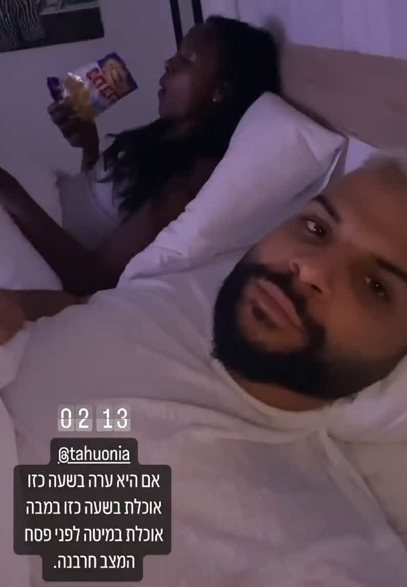 גם מי שהפכו לאחרונה לצמד קומי בלתי נפרד, כוכבי "האח הגדול" ליאל קוצרי וטהוניה רובל העלו תיעוד לרשת האינסטגרם מהשעות הקטנות של הלילה שבו כתב ליאל: "אם היא ערה בשעה כזו, אוכלת בשעה כזו במבה, אוכלת במיטה לפני פסח, המצב חרבנה".