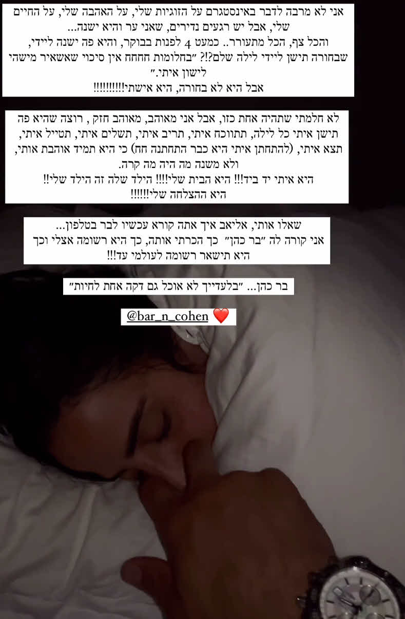 אליאב החליט לשתף את עוקביו בסטורי חשוף באמצע הלילה שכולו מוקדש לבר כהן: "אני לא מרבה לדבר באינסטגרם על הזוגיות שלי, על האהבה שלי, על החיים שלי. אבל יש רגעים נדירים, שאני ער והיא שנה… והכל צף, הכל מתעורר.. כמעט 4 לפנות בוקר, והיא ישנה פה ליידי, שבחורה תישן לידי לילה שלם!? 'בחלומות חחח אין סיכוי שאשאיר מישהי לישון איתי.' אבל היא לא בחורה, היא אשתי!".