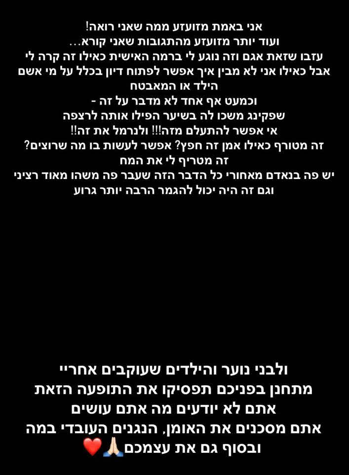 "אני באמת מזועזע ממה שאני רואה! ועוד יותר מזועזע מהתגובות שאני קורא. עזבו שזאת אגם וזה נוגע לי ברמה האישית כאילו זה קרה לי. אבל כאילו אני לא מבין איך אפשר לפתוח דיון בכלל על מי אשם, הילד או המאבטח וכעט אף אחד לא מדבר על זה שפקינג משכו לה בשיער והפילו אותה לרצפה, אי אפשר להתעלם מזה!".