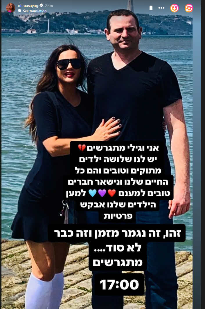 אסייג שיתפה בסטורי שלה: "אני וגילי מתגרשים, יש לנו שלושה ילדים מתוקים וטובים והם כל החיים שלנו ונשאר חברים טובים למענם. למען הילדים שלנו אבקש פרטיות".