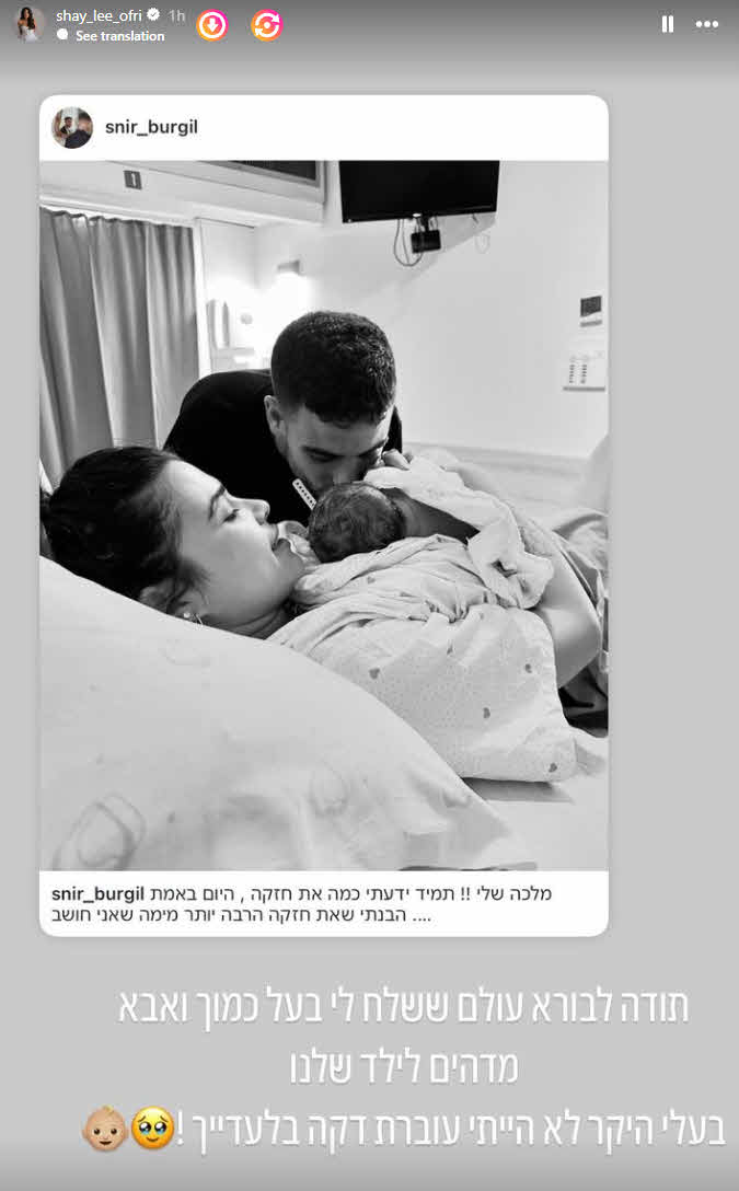 שניר בורגיל החליט לשתף את התמונה הראשונה שלו לצד שי לי עופרי והבן הטרי מבית החולים לצד מסר מרגש במיוחד: "מלכה שלי! תמיד ידעתי כמה את חזקה, היום באמת הבנתי שאת חזקה הרבה יותר מימה שאני חושב. אני מודה לאל בכל יום שאת הזיווג המיועד לי משמיים שאת הכוח שמחזיק אותי, את הצחוק שממלא אותי, והחום שעוטף אותי".