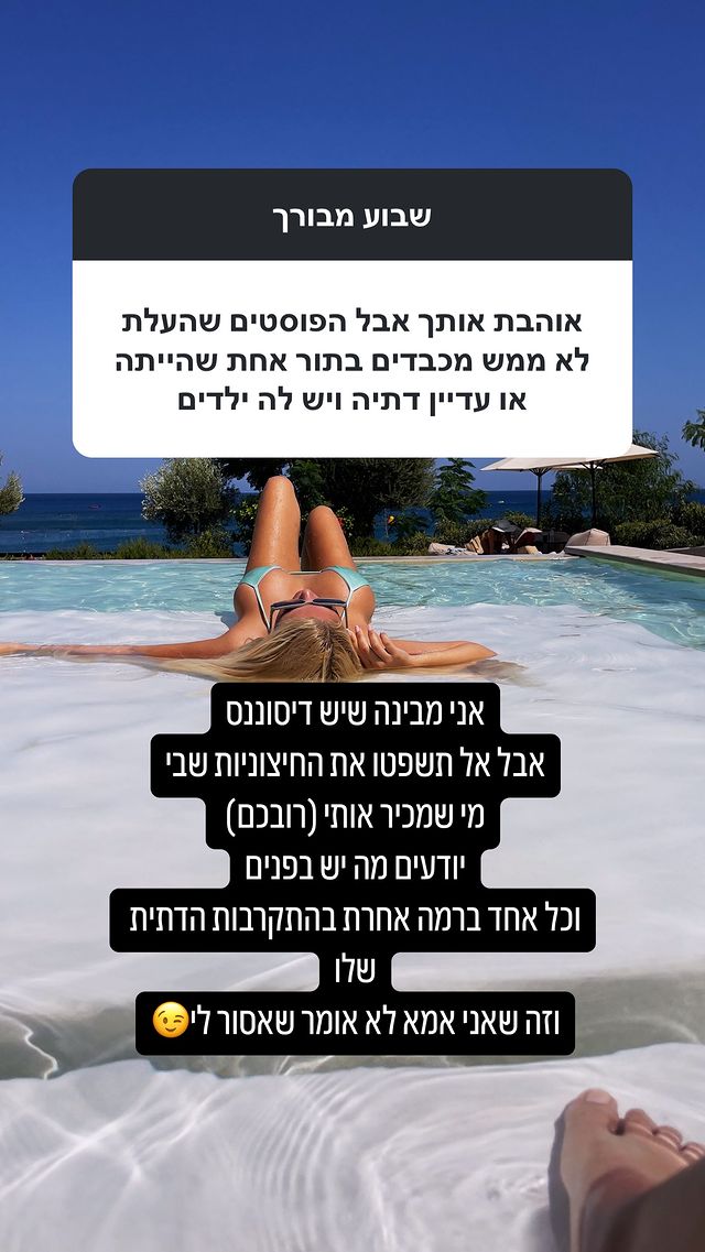 אחת הגולשות הטיחה בקצין בפוסט לצד שלל התמונות בבגד הים מבריכת המלון: "העיקר שהילדים שלה בלבוש צנוע, מסגרת דתית והילד עם כיפה. בושה לילדים שלה, גם השפתיים דורשים כבר תשלום ארנונה חחח".