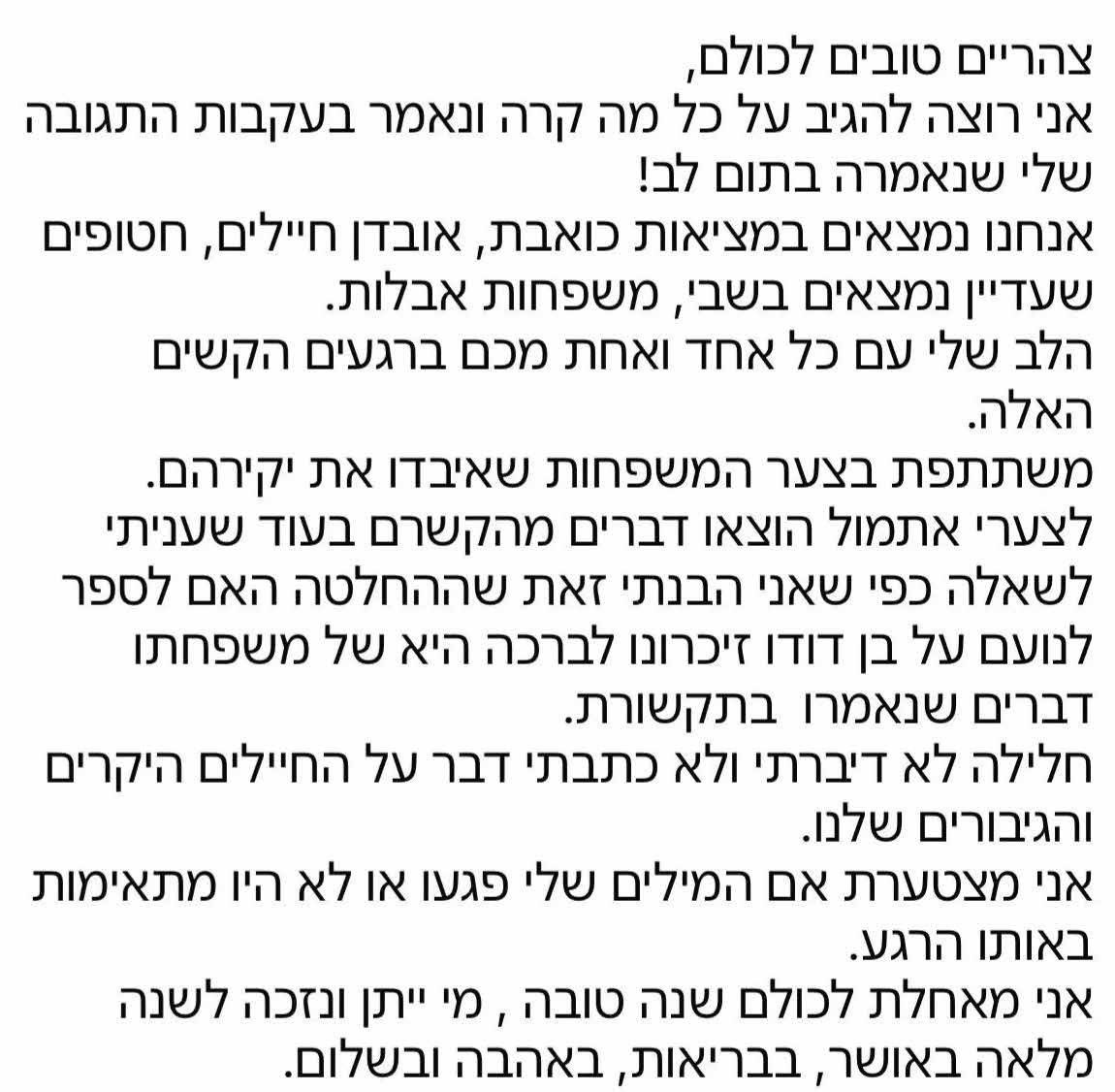 והוסיפה: "חלילה לא דיברתי ולא כתבתי דבר על החיילים היקרים והגיבורים שלנו. אני מצטערת אם המילים שלי פגעו או לא היו מתאימות באותו הרגע".