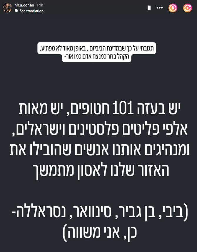 והוסיף: "יש בעזה 101 חטופים, יש מאות אלפי פליטים פלסטינים וישראלים, ומנהיגים אותנו אנשים שהובילו את האזור שלנו לאסון מתמשך(ביבי, בן גביר, סינוואר, נסראללה – כן, אני משווה).