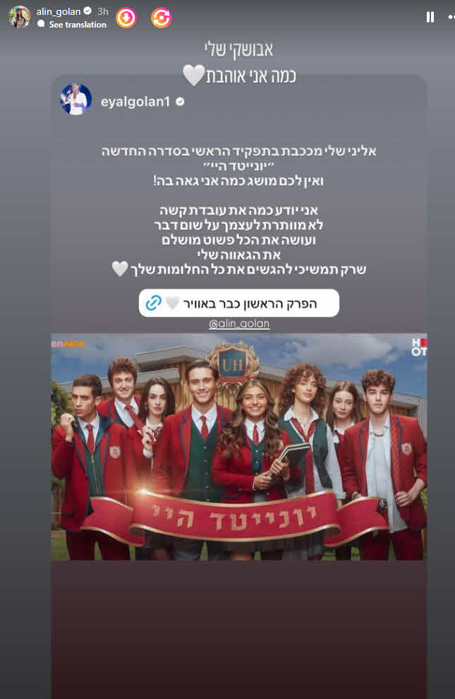 אלין שמשתתפת בימים אלו בתפקיד משחק ראשי בסדרה החדשה בהוט – "יונייטד היי" לצד לא מעט שחקנים מוכרים ומכובדים, זכתה להרעפת אהבה של ממש מאביה ואמה. גולן החליט להקדיש לבתו סטורי מרגש שבו כתב: