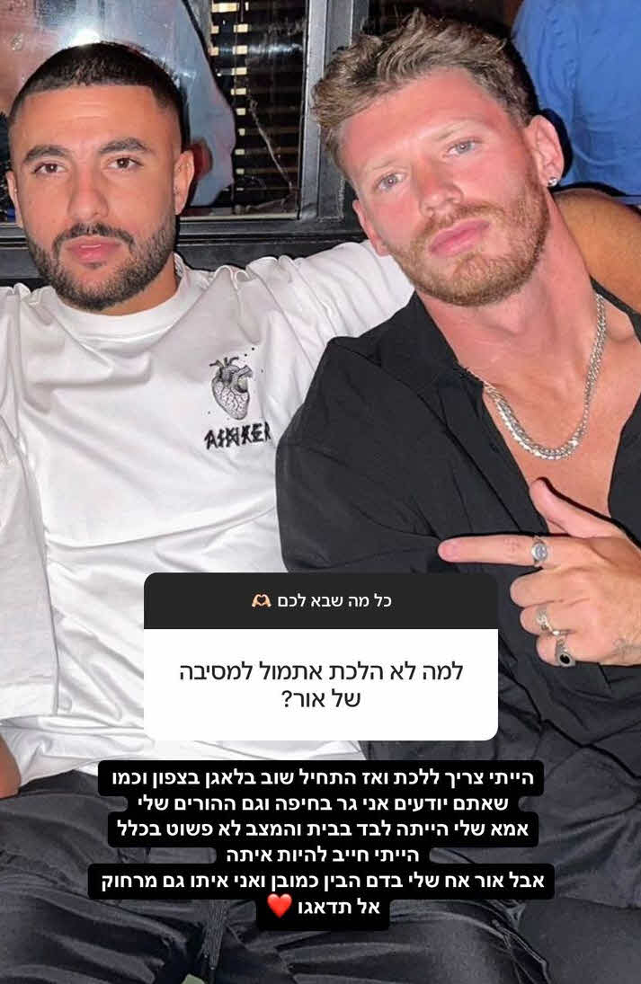 "הייתי צריך ללכת ואז התחיל שוב בלאגן בצפון. וכמו שאתם יודעים, אני גם בחיפה וגם ההורים שלי. אמא שלי הייתה לבד בבית והמצב לא פשוט בכלל, הייתי חייב להיות איתה. אבל אור אח שלי בדם, הבין כמובן ואני איתו גם מרחוק, אל תדאגו".