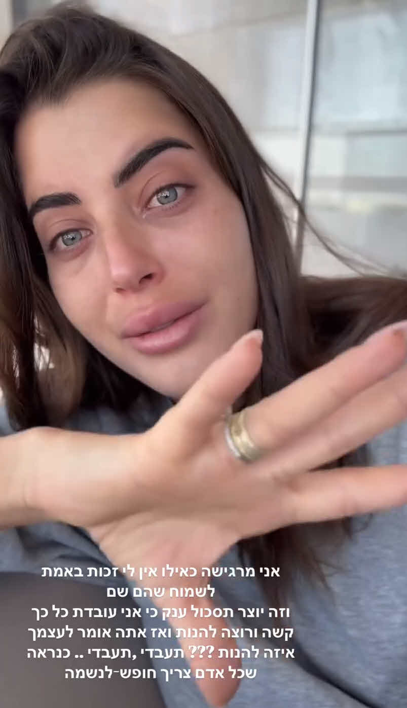 "או שהיא הורמונלית או שאני לא יודעת. אבל לעבוד 8.5 שעות כמו שאני עובדת בשביל משכורת 6,000 ולעשות את הכסף שהמשפעיניות עושות(שזה מקסים ומדהים והלוואי עליי) זה חוצפה לבכות על דבר כזה".