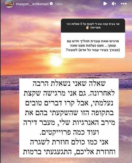 לצד לא מעט דברים שחשפה אשכנזי בראיון מקיף עליה ועל בן זוגה. נראה שעקבותיה ברשתות החברתיות קצת דעכו. אחת העוקבות שאלה אותה:"מרגיש שאת עוברת תהליך חדש עם עצמך… מעט נעלמת, מעט שונה. זה לטובה?".