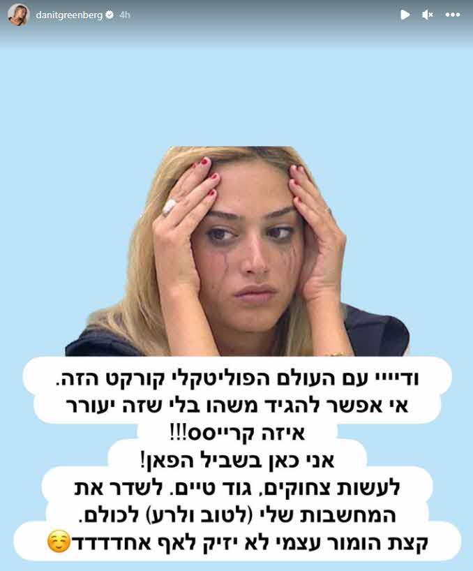 דנית התייחסה גם לתגובה שלה לנופר מור בסטורי וטענה שלא מדובר בעקיצה אלא בצחוקים בלבד:"ודיי עם העולם הפוליטיקלי קורקט הזה. אי אפשר להגיד משהו בלי שזה יעורר איזה קרייסס! אני כאן בשביל הפאן! לעשות חוקים, גוד טיים. לשדר את המחשבות שלי(לטוב ולרע) לכולם. קצת הומור עצמי לא יזיק לאף אחד."