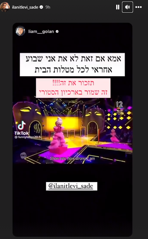 ליאם הצטרף לאחותו והעלה סטורי משעשע בו כתב: "אמא, אם זאת לא את, אני שבוע אחראי על כל מטלות הבית". אילנית לקחה ברצינות וענתה לו: "תזכור את זה!!!! זה שמור בארכיון הסטורי". אותנו התכנית הזו מבלבלת, נותר רק לנחש ולצפות שנראה את אילנית לוי מורידה את מסכת הצמר גפן.
