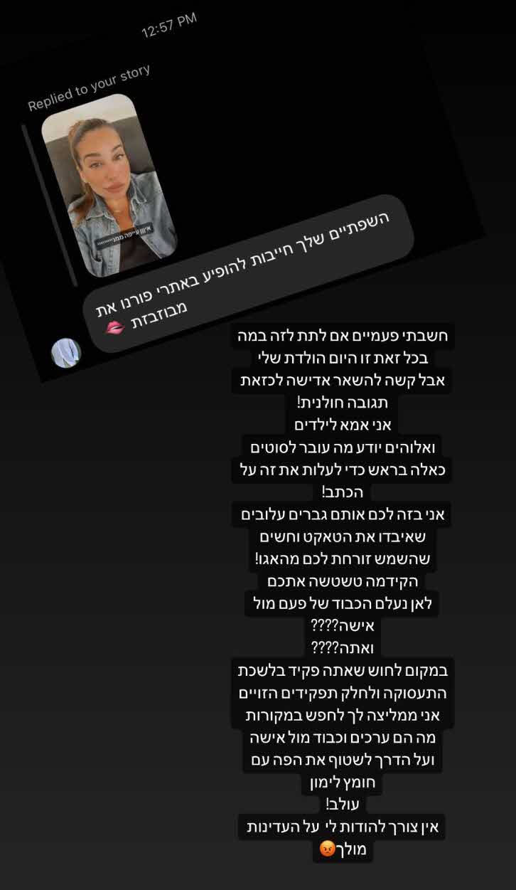 אך הפעם עוקב אחד החליט לשלוח לה לרגל יום הולדתה הודעה מטרידה במיוחד:"השפתיים שלך חייבות להופיע באתרי פ*רנו, את מבוזבזת." מירב לא נשארה אדישה ושיתפה את תחושותיה ולא חסכה במילים!