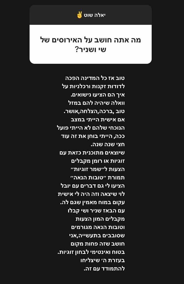 "עם הבאז שניר ושי קיבלו ומקבלים המון הצעות וטובות הנאה מגורמים שסובבים בתעשייה, אני חושב שזה פחות מקום בטוח ואינטימי לבחון זוגיות. בעזרת ה' שיצליחו להתמודד עם זה."
