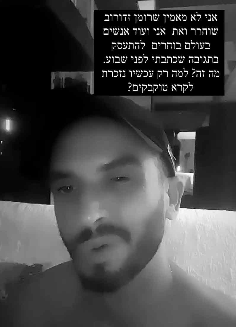 והוסיפה:"אני לא יודעת איזה בעיה יש לך איתי, אבל אם יש לך איזה בעיה באמת.. בוא בוא תשלח לי הודעה ואני אשמח שנדבר ואם לא אז אתה פשוט בן אדם … כאילו אתה יודע מה הכי מעצבן אותי, שאתה בן אדם שמאוד מוכר בתעשייה כביכול ואתה נותן לזה יד. אתה יודע שיש לך את הכח הזה ואתה נותן לזה יד וזה ממש מגעיל, ובאמת שאתה באמת אפס מושיקו… כל האהבה שהייתה לי אליך פשוט …"