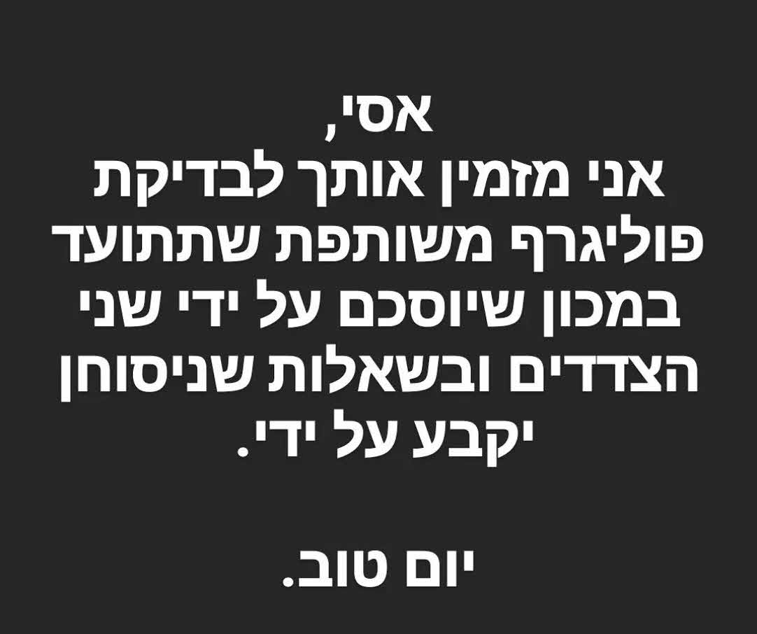 עצתי לאסי לא להיגרר אחר הפרובקציות של יהודה. הפוליגרף שנעשה אמור להספיק. תמשיך קדימה, אוהבים אותך😍