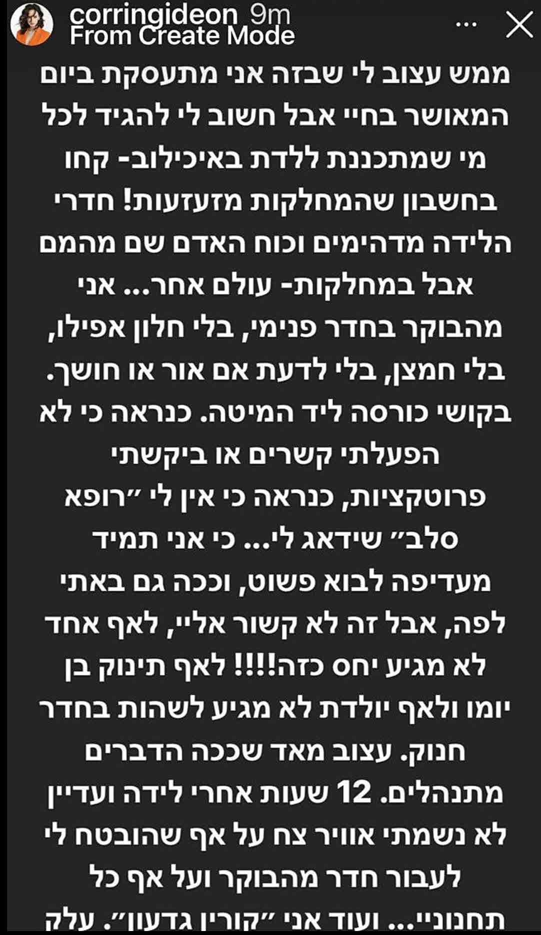 אין כמעט בית בישראל שלא נחשף אתמול לידיעה על לידת בתה הבכורה של המנחה קורין גדעון שהחליטה לא לשתוק והביעה תלונה חריפה בסטורי שלה על התנאים שקיבלה במחלקת היולדות באיכילוב, למקרה שבטעות לא נחשפתם, אלו הדברים שכתבה: