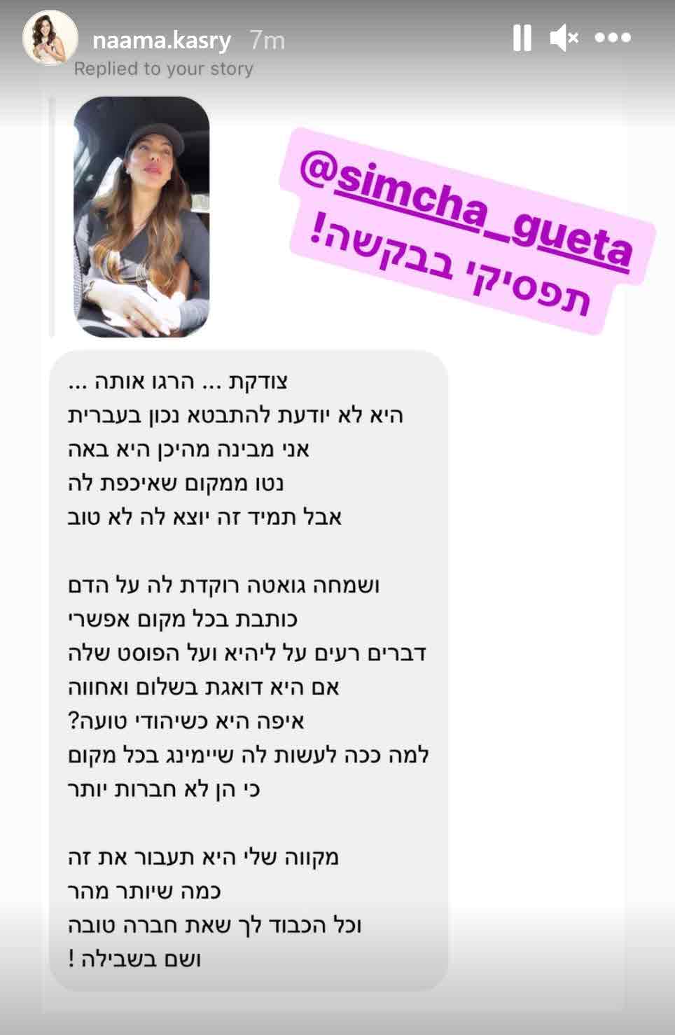 חברתה הטובה של גרינר, נעמה קסרי החליטה לצאת היום להגנתה אחרי שהרוחות מעט שקטו בסופ"ש האחרון והגיבה בסטוריז שלה בין היתר:"אני מכירה את ליהיא טוב ואני יודעת שהיא לא בן אדם רע." והוסיפה:"היא לא אמרה את זה בגלל איזשהי דיעה שיש לה על דתיים או משהו קשה, אני יודעת שלא.. היא אימפולסיבית, זה היה התבטאות שהיא מצטערת עליה מאוד, היא מתייסרת, היא כאובה..".