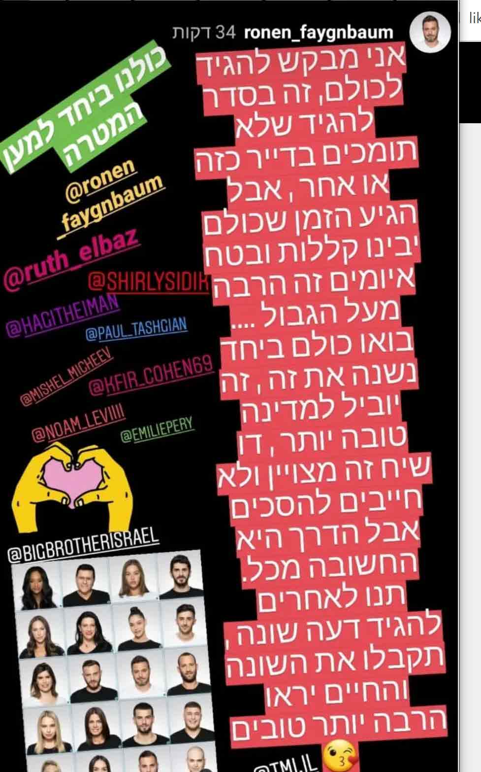 רונן העלה את הפוסט הבא לפרופיל האינסטגרם שלו בעקבות הדברים הקשים שמתחרשים כלפי הדיירים ברשת: "אני מבקש להגיד לכולם, זה בסדר שלא תומכים בדייר כזה או אחר אבל הגיע הזמן שכולם יבינו שקללות ואיומים זה מעבר לגבול. בואו כולם ביחד נשנה את זה, זה יוביל למדינה טובה יותר. דו שיח זה מצוין ולא חייבים להסכים אבל הדרך היא החשובה מכל. קבלו את השונה והחיים יראו הרבה יותר טובים".
