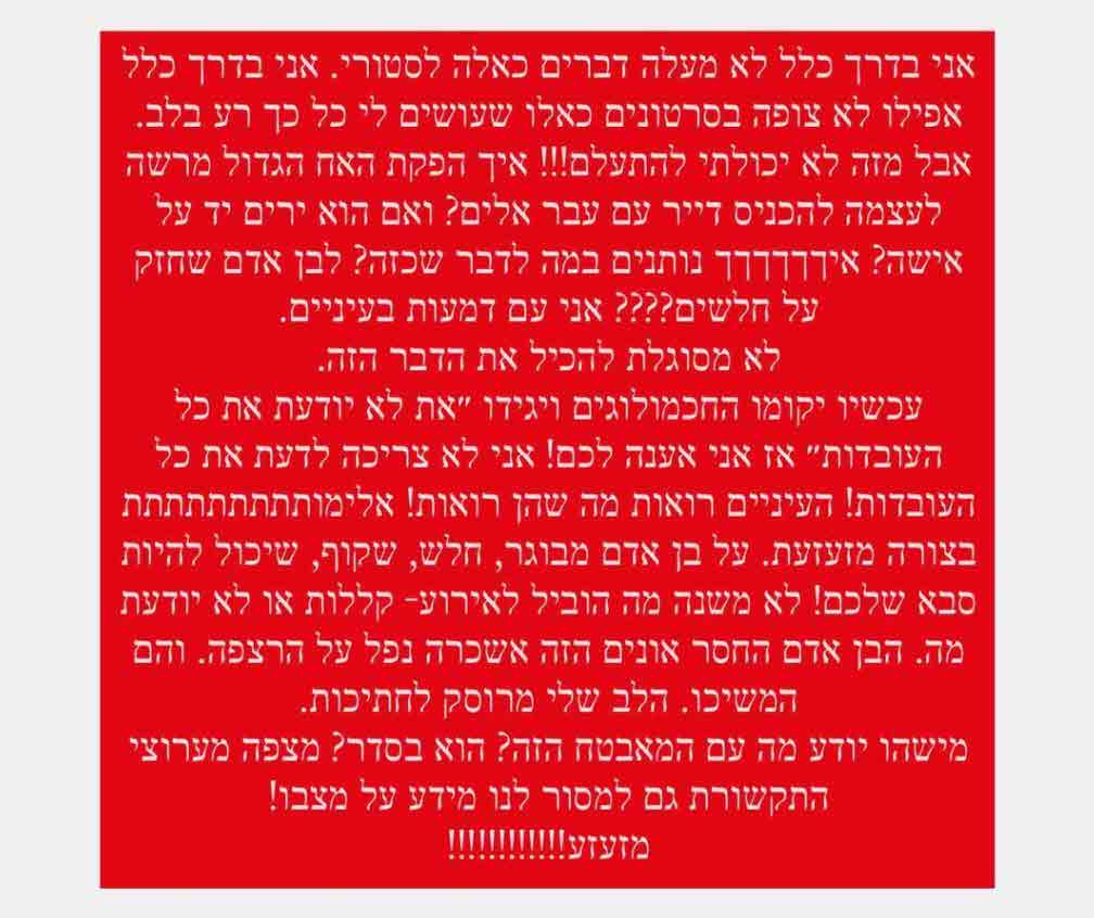 והוסיפה:"ואם הוא ירים יד על אישה? איךךךךך נותנים במה לדבר שכזה? לבן אדם שחזק על חלשים??? אני עם דמעות בעיניים."