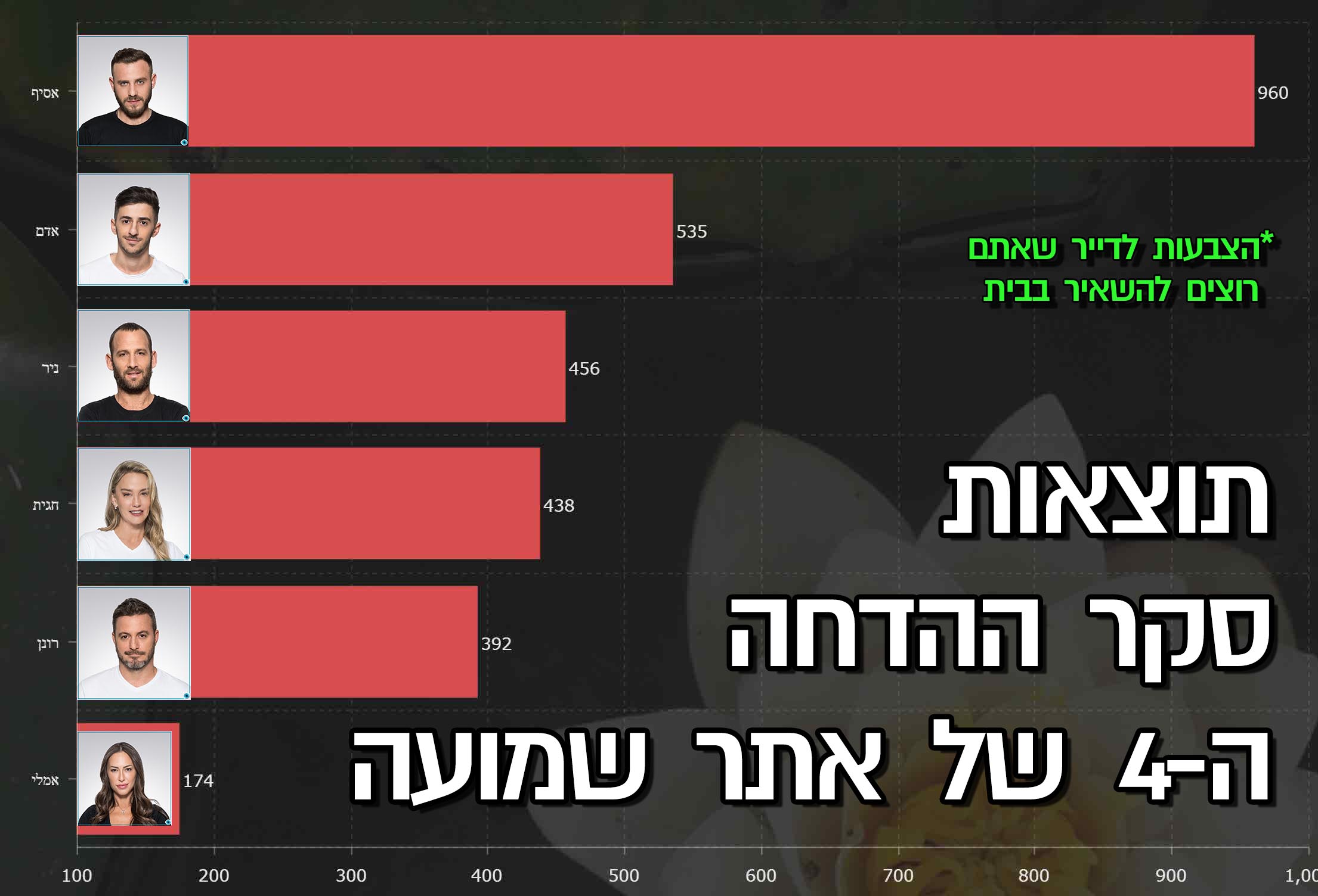 3000 הצבעות נספרו בסקר החדש והמאובטח של אתר שמועה, העוקבים שלנו באינסטגרם כבר קיבלו בלעדית ונחשפו לתוצאות ההצבעה של סקר ההדחה מדי יום ועכשיו קבלו את המדגם הסופי של סקר שמועה להדחה ה-4 של העונה!