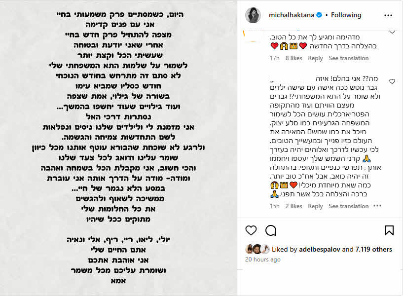 ובין היתר חשפה: "לא סתם זה מתרחש בחודש הנוכחי, חודש כסלו שמביא עמו בשורה של גילוי, אמת שצפה, ועוד גילויים שעוד יחשפו בהמשך…". נראה שהפוסט הזה של מיכל הצליח לעורר גל של תגובות מחזקות במיוחד מצד לא מעט מפורסות ועוקבות.