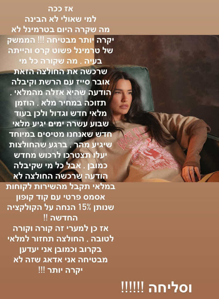 עוד שיתפה: "זה לא מרגיש לי בכלל שזה יפה להתנהג ככה. בואו, איפה החווית קניה שלנו? קיבלתי מלא הודעות מכן שעשו לי צביטה בלב ולא היה לי נעים. אף אחת לא אמורה לקום ב-5 או 4 בבוקר ואז אומרים לה שהמלאי לא קיים".
