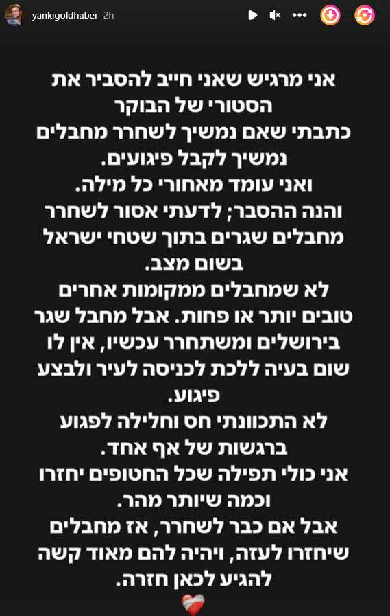 יענקי סיכם ועדכן את עוקביו: "לא התכוונתי חס וחלילה לפגוע ברגשות של אף אחד. אני כולי תפילה שכל החטופים יחזרו וכמה שיותר מהר. אבל אם כבר לשחרר, אז מחבלים שיחזרו לעזה, ויהיה להם מאוד קשה להגיע לכאן חזרה".