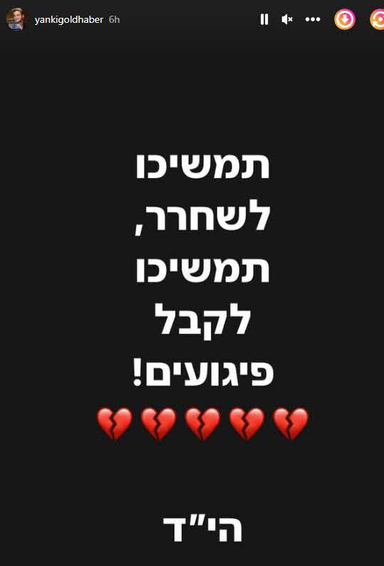 פיינליסט "האח הגדול" יענקי גולדהבר שבעוד קצת יותר משבועיים יעלה על מדי זית ויתגייס לצבא ההגנה לישראל. שיתף את עוקביו ברגשותיו לגבי שחרור המחבלים כחלק מעסק החטופים, וזאת לצד הפיגוע הרצחני שהתרחש היום בבוקר בירושלים.