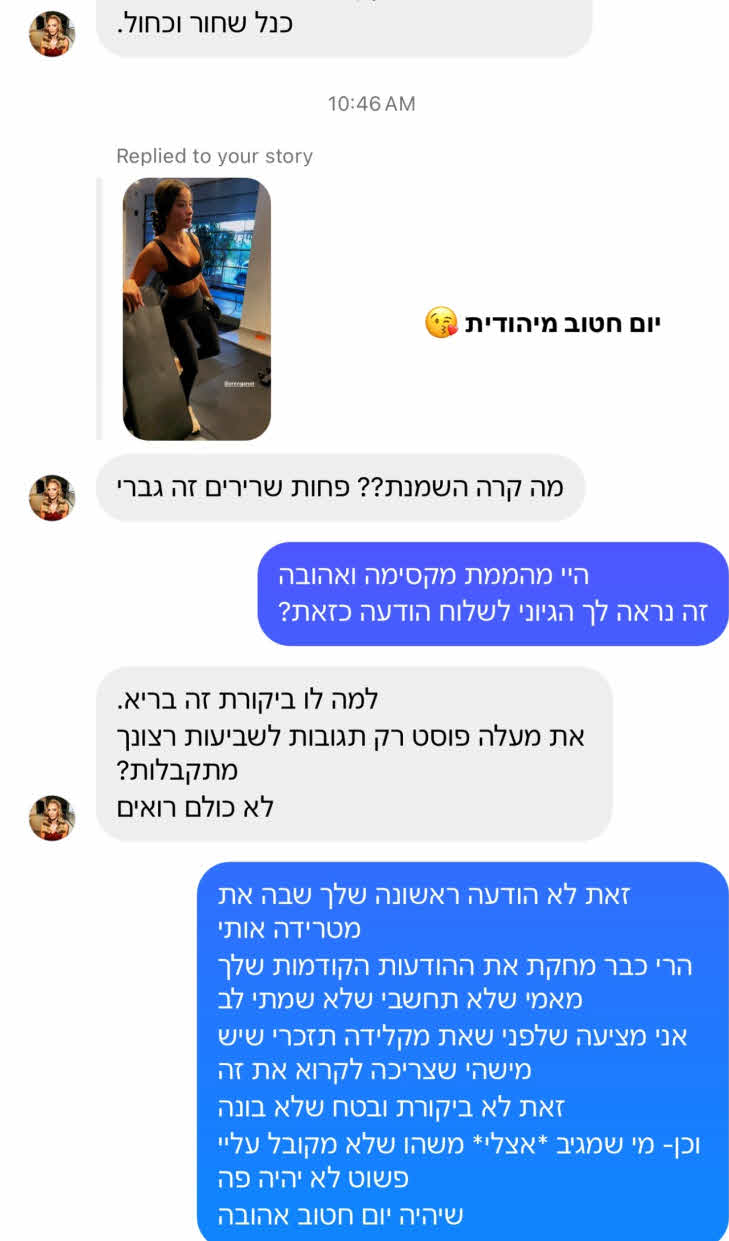 "היי מהממת, מקסימה ואהובה. זה נראה לך הגיוני לשלוח הודעה כזאת?". ובתגובה ספגה: "למה לא? ביקורת זה בריא. את מעלה פוסט ורק תגובות לשביעות רצונך מתקבלות? לא כולם רואים".
