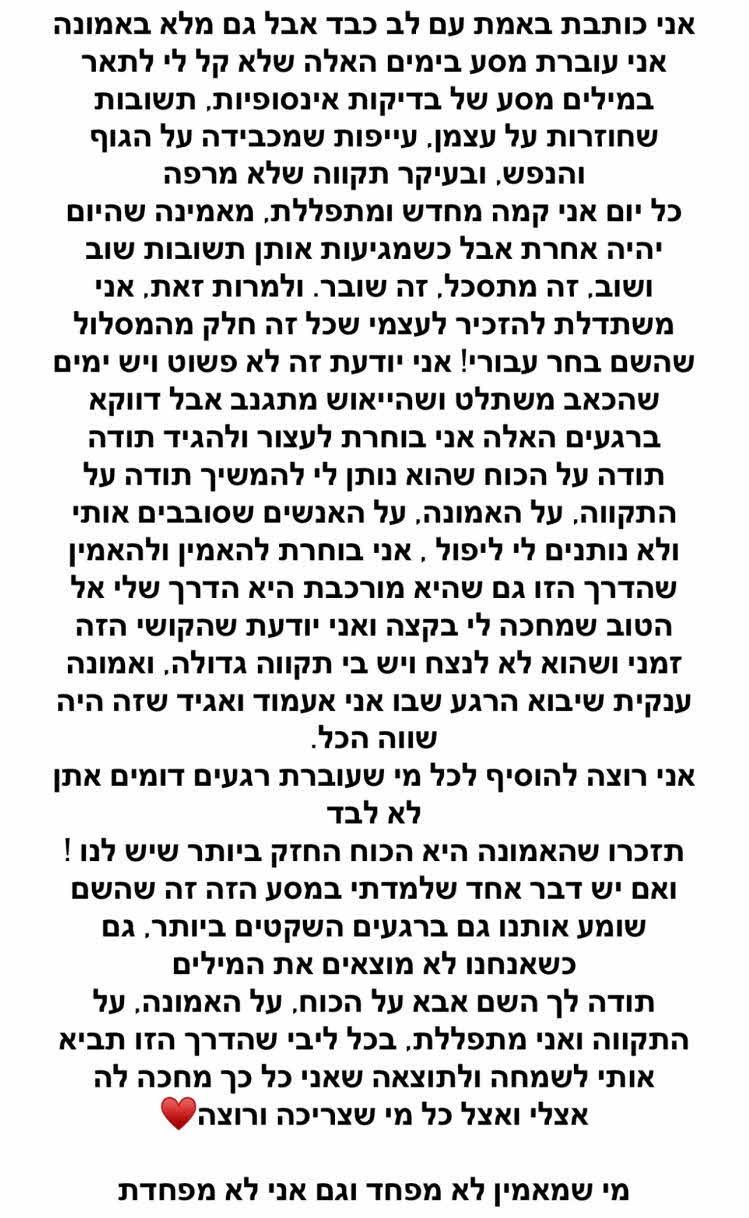 "אני כותבת באמת עם לב כבד אבל גם מלא באמונה. אני עוברת מסע בימים האלה שלא קל לי לתאר במילים, מסע של בדיקות אינסופיות, תשובות שחוזרות על עצמן, עייפות שמכבידה על הגוף והנפש, ובעיקר תקווה שלא מרפה".