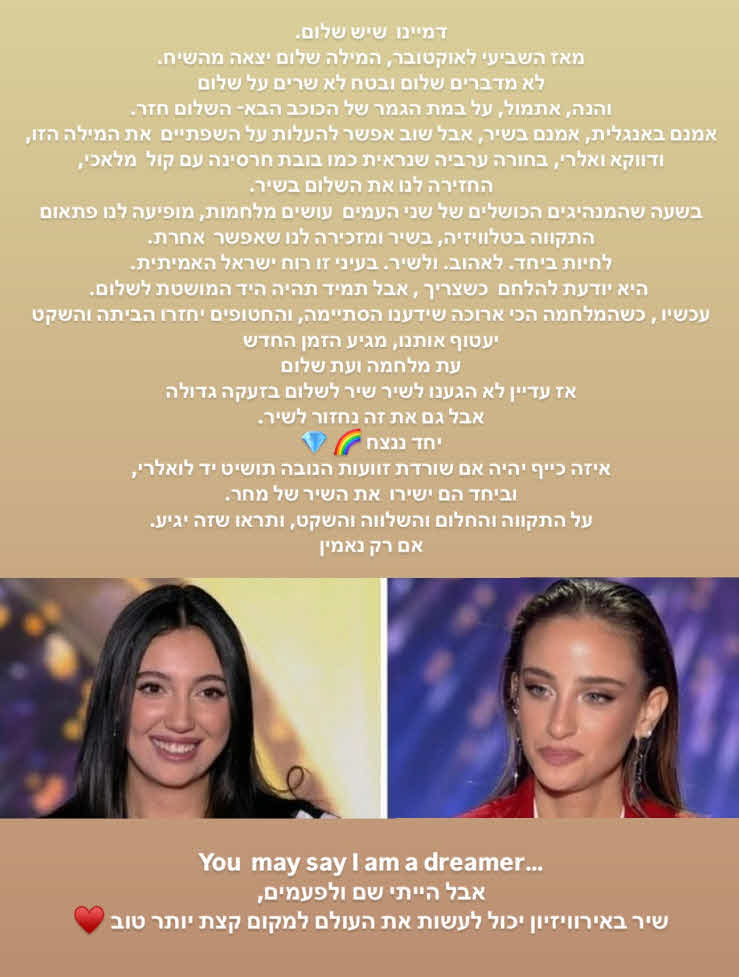 "עת מלחמה ועת שלום. אז עדיין לא הגענו לשיר לשלום בזעקה גדולה, אבל גם את זה נחזור לשיר. יחד ננצח. איזה כיף היה אם שורדת זוועות הנובה תושיט יד לאלרי, וביחד הם ישירו את השיר של מחר. על התקווה והחלום והשלווה והשקט, ותראו שזה יגיע. אם רק נאמין. You may say I am a dreamer… אבל הייתי שם ולפעמים, שיר באירוויזיון יכול לעשות את העולם למקום קצת יותר טוב".