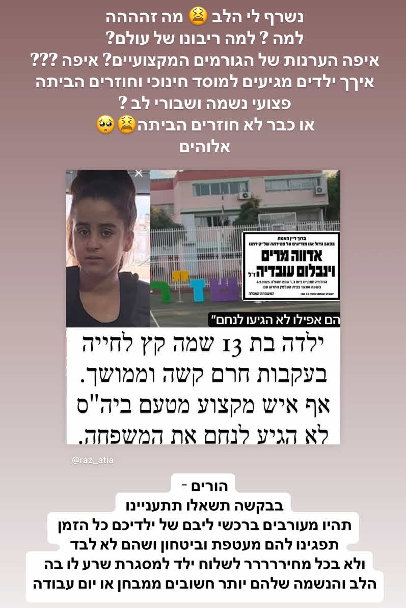 דניאל שיתפה את תחושותיה הקשות: "נשרף לי הלב, מה זה. למה? למה ריבונו של עולם? איפה הערנות של הגורמים המקצועיים? איפה? איך ילדים מגיעים למוסד חינוכי וחוזרים הבית פצועי נשמה ושבורי לב? או כבר לא חוזרים הביתה".