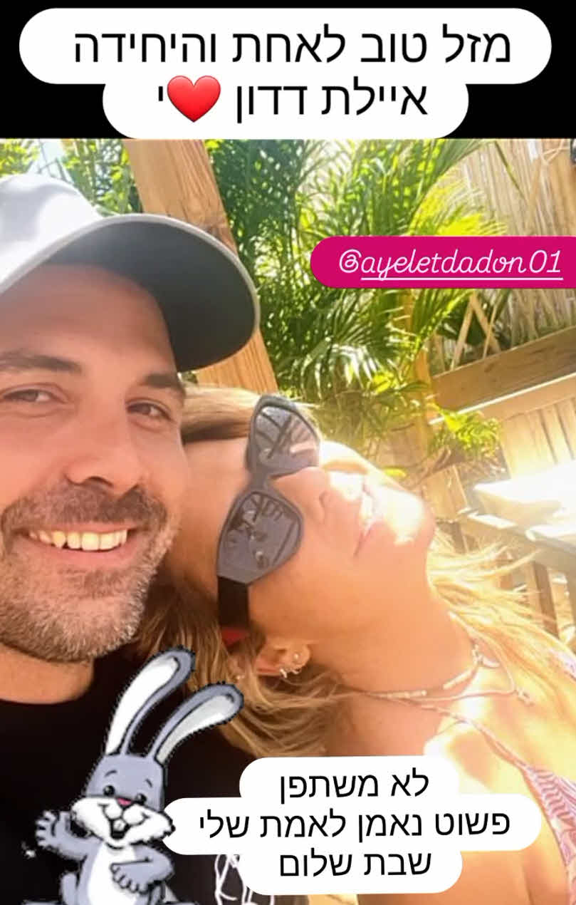 אביחי החליט להעלות היום (שישי) סטורי ובו תמונה שלו לצד בת הזוג המתקאמבקת, איילת דדון והכיתוב: "מזל טוב לאחת והיחידה, איילת דדון". לצד אמוג'י לב בתוספת האות "י".