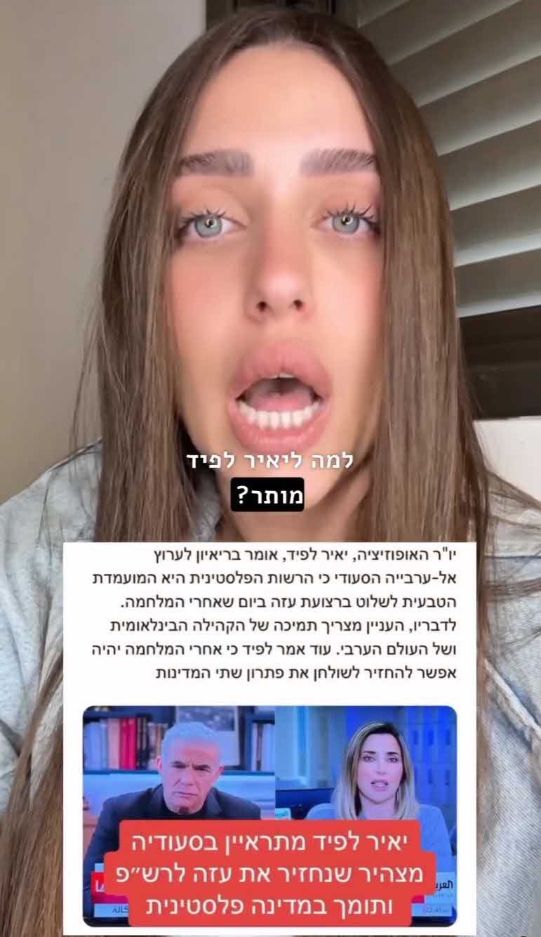 כוכבת "האח הגדול" החליטה לשתף מקטע ובו נכתב כי יושב ראש האופוזיציה, יאיר לפיד אמר בראיון לערוץ אל-ערבייה הסעודי כי הרשות הפלסטינית היא המועמדת הטבעית לשלוט בעזה לאחר המלחמה. ואף טען כי יהיה אפשר להחזיר לשולחן את פתרון שתי המדינות.