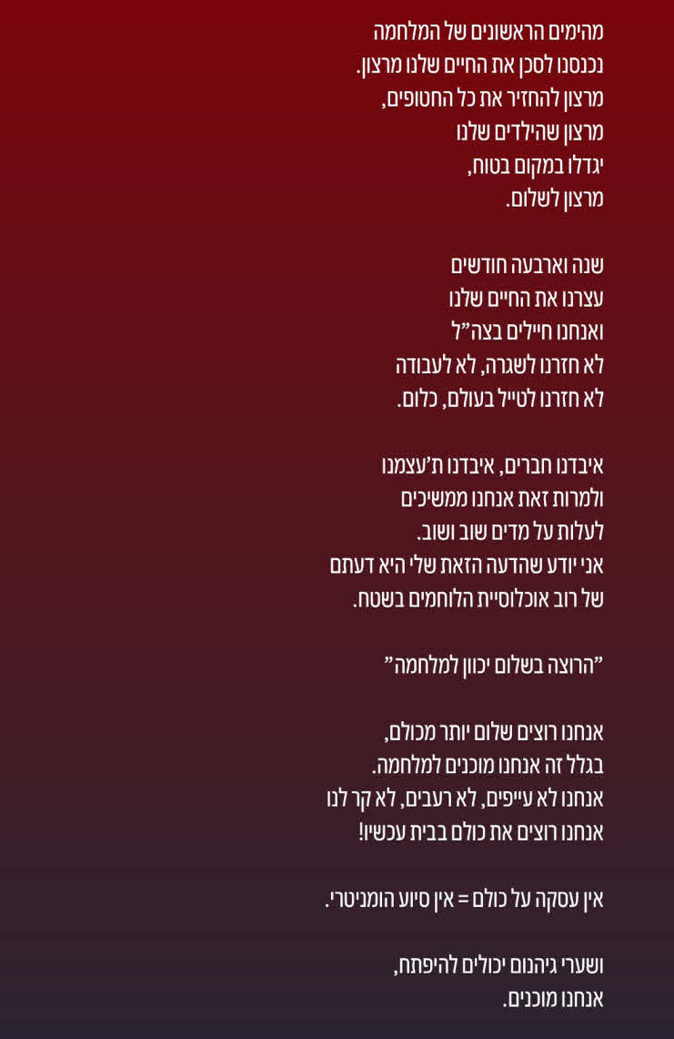 והוסיף: "שנה וארבעה חודשים עצרנו את החיים שלנו ואנחנו חיילים בצה'ל. לא חזרנו לשגרה, לא לעבודה לא חזרנו לטייל בעולם, כלום. איבדנו חברים, איבדנו את עצמנו, ולמרות זאת אנחנו ממשיכים לעלות על מדים שוב ושוב".