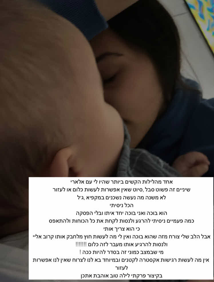 והוסיפה לפרוק את התסכול: "לא משנה מה נעשה, נשכנים במקפיא, ג'ל, הכל ניסיתי. הוא בוכה ואני בוכה יחד איתו ובלי הפסקה. כמה פעמים ניסיתי להירגע ולנסות לקחת את כל הכוחות ולהתאפס כי הוא צריך אותי, אבל הלב שלי צורח מזה שהוא בוכה ואין לי מה לעשות חוץ מלחבק אותו קרוב אלי ולנסות להרגיע אותו, מעבר לזה כלום!".