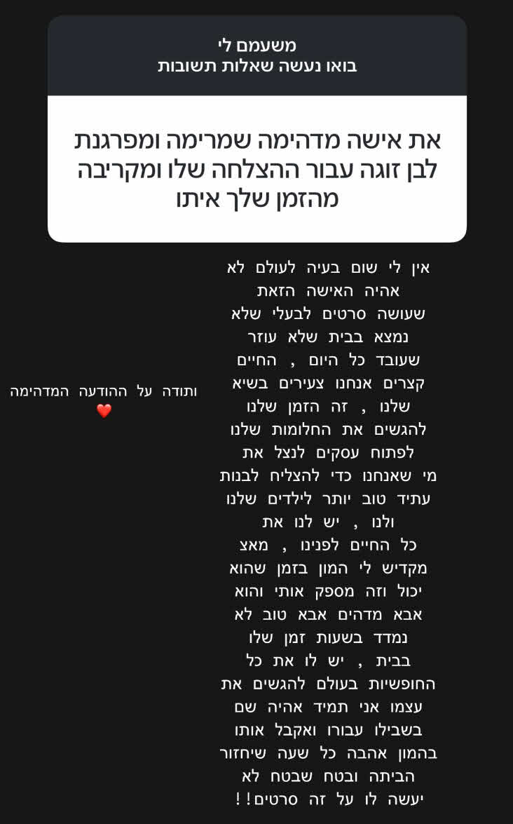 וסיכמה: "אני תמיד אהיה שם בשבילו, עבורו, ואקבל אותו בהמון אהבה כל שעה שיחזור הביתה. ובטח שבטח לא אעשה לו סרטים! ותודה על ההודעה המדהימה".