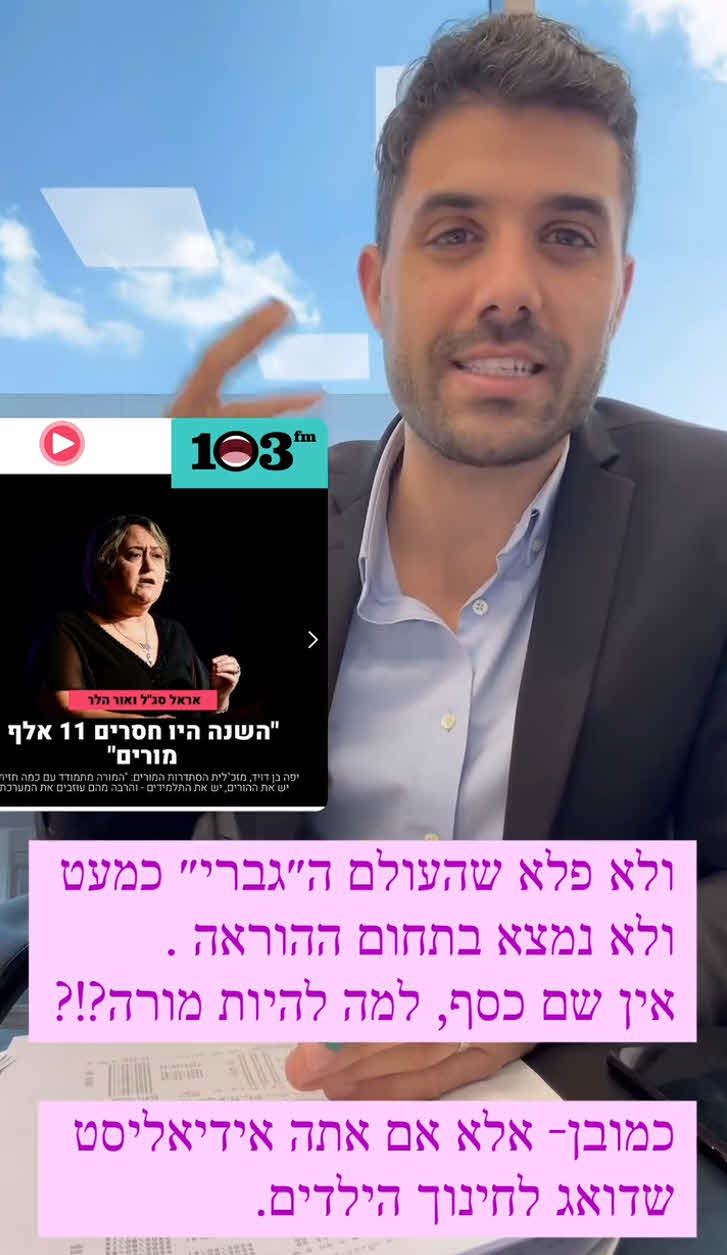 "בחור או בחורה מסיימים צבא רואים כל היום בטיקטוק רואי חשבון, עורכי דין, הייטקיסטים, נדל'ניסטים, סוכני ביטוח, העולם הפיננסי כולו מלא כסף! ואז מה הוא אומר לעצמו. רגע, לאיפה אני אלך? מה אני אלך להיות מורה!? אם אין לך אידיאל מסוים אין שום סיבה להיות מורה, אין שום סיבה להיות מורה, זו האמת וזה עצוב. המורים לא מתוגמלים אז אין סיבה להיות מורה".