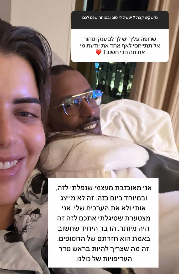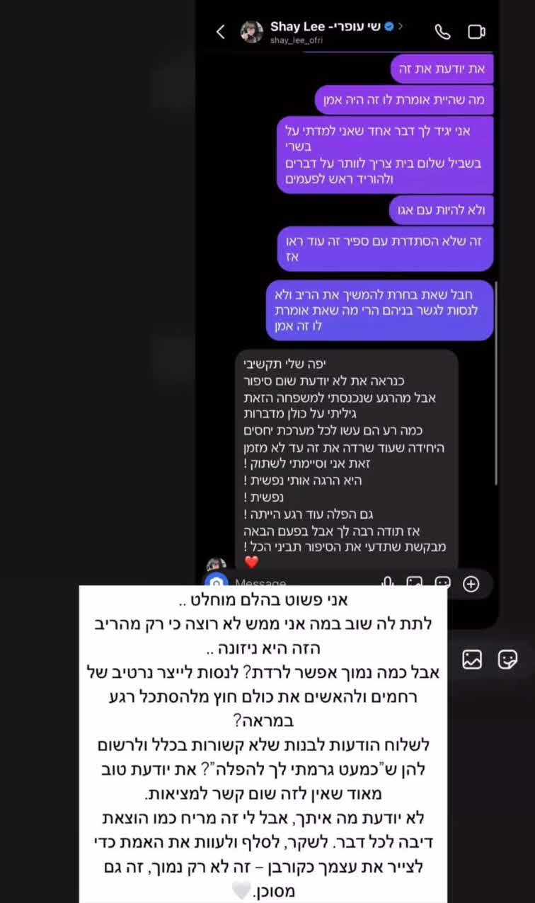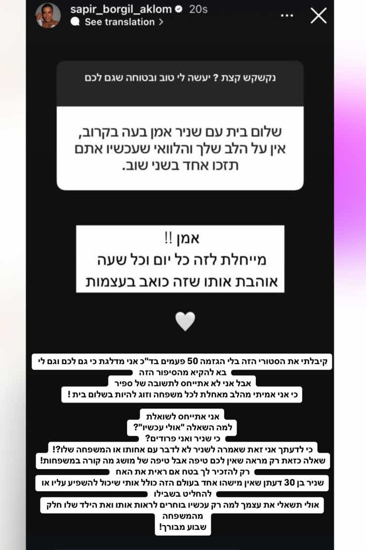 אלא שהתשובה הזו כנראה לא מצאה חן בעיני שי, שהגיבה בחריפות בסטורי משלה: "קיבלתי את הסטורי הזה בלי הגזמה 50 פעמים. בד'כ אני מדלגת כי גם לכם וגם לי בא להקיא מהסיפור הזה, אבל אני לא אתייחס לתשובה של ספיר, כי אני אמיתי מהלב מאחלת לכל משפחה וזוג להיות בשלום בית!".